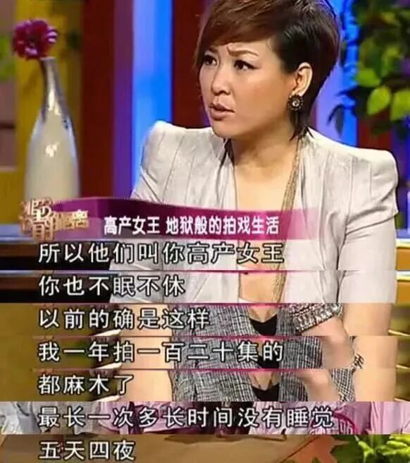 为拍戏,曾五天四夜不睡觉,一年连拍一百二十多集,被称为“高产女王”。