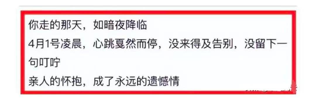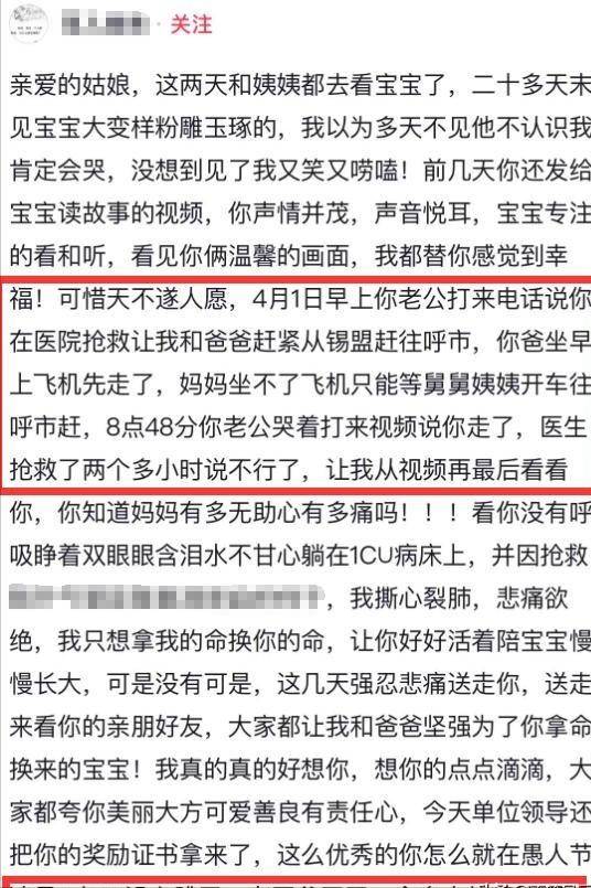 3月28日,她发布最后一条动态,照片里她抱着宝宝,眼下遮盖不住的黑眼圈,带着明显的疲惫,但她依旧是笑容满面。 可谁也没料到,在4月1日这个本该欢声笑语的愚人节,却成了张筱雨家人永远的噩梦。 那天凌晨,张筱雨的母亲在睡梦中接到女婿的电话,得知女儿被紧急送往医院,情况十分紧急。两位老人顾不上其他,立刻购买前往女儿的城市的票,可由于张筱雨的母亲没有办法乘坐飞机,只好父亲先去,母亲只能等张筱雨的舅舅姨姨开车前往,他们始终不敢相信,这个前两天还在一起说说笑笑的女儿会遭遇不测。 可就在赶路的途中,噩耗再次传来,自己的女儿经抢救无效离世。